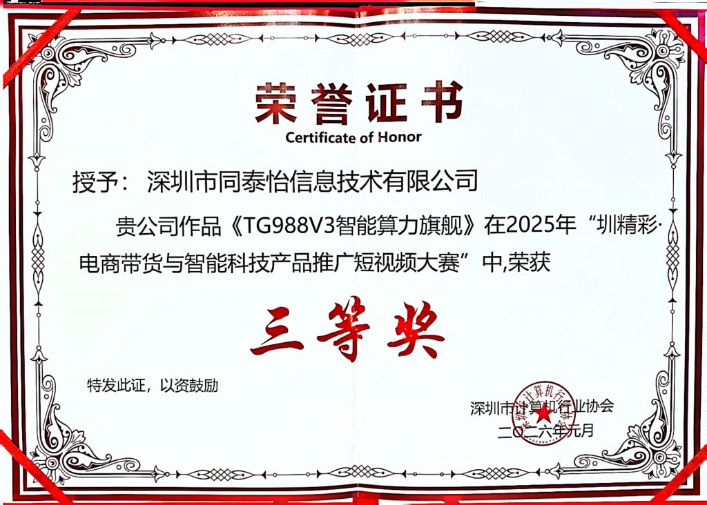 与此同时,同泰怡积极拥抱新媒体传播趋势,精心策划并制作了短视频《TG988V3智能算力旗舰》,生动呈现了最新一代智能算力产品的技术亮点与应用场景。在“圳精彩·电商带货与智能科技产品推广短视频大赛”众多参赛作品中脱颖而出,荣获三等奖。