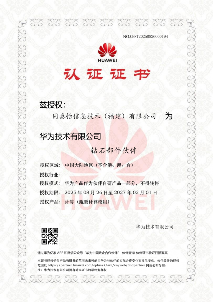 同泰怡是华为认证的“双钻石部件伙伴”(KPN+APN),“钻石部件伙伴”是华为面向合作伙伴体系中的最高授权等级之一,代表华为对其技术能力、市场贡献与协同发展潜力的最高度肯定。获得该地位,意味着同泰怡并非普通的销售代理或服务商,而是获准将华为的核心计算硬件(鲲鹏模组/昇腾NPU)作为关键部件,深度集成到自主设计与研发的整机或解决方案中。这种“华为硬件+伙伴自研”的合作模式,要求伙伴具备强大的硬件设计、底层调优、软件适配及行业应用开发能力。同泰怡连获双项认证,充分证明了在技术整合与行业创新上的卓越实力,已跻身华为核心生态圈,能够基于华为的“根技术”共同打造面向客户需求的创新型联合解决方案。