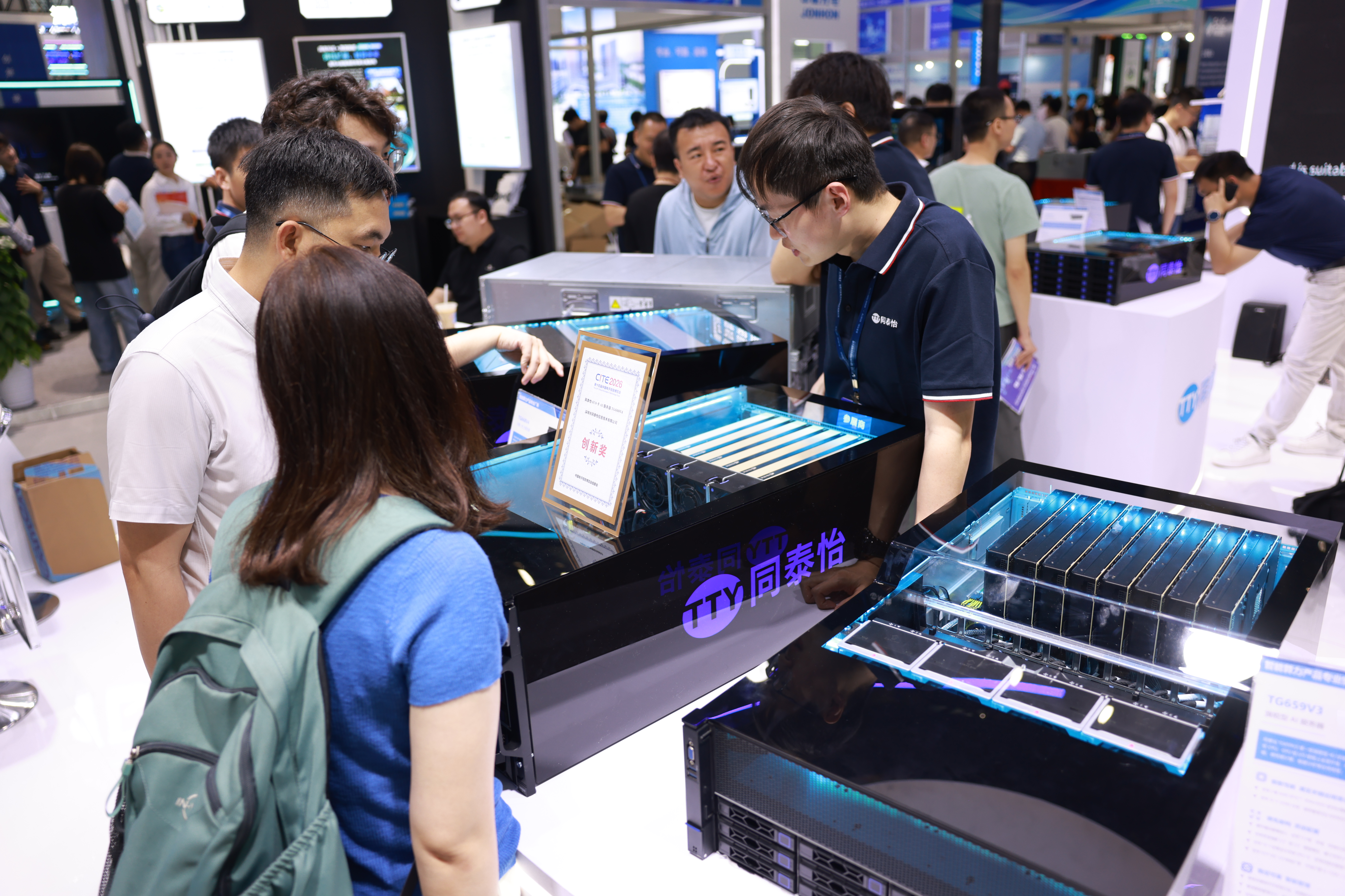 4 月 9 日 —11 日,以“新技术、新产品、新场景”为主题的第十四届中国电子信息博览会(CITE 2026)在深圳会展中心(福田)成功举办。同泰怡携多款国际与国产技术路线的创新产品亮相,全面展示了包括通用服务器、智算服务器、高密度算力平台、训推一体机、鲲鹏系列主板、液冷工作站及全国产化数据中心产品在内的最新成果,成为展会现场备受关注的焦点。