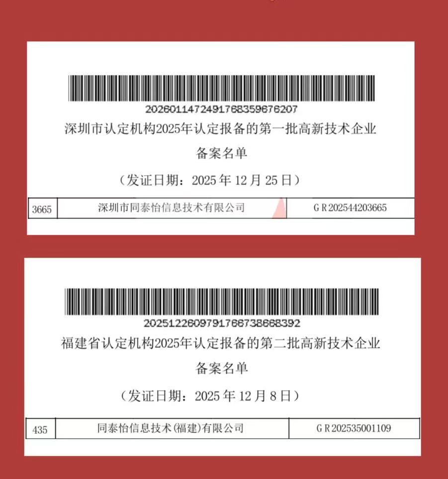 近日,国家高新技术企业认定管理工作网正式公示最新一批认定名单,深圳市同泰怡信息技术有限公司凭借持续的自主研发能力与核心技术优势,高分通过国家高新技术企业认定,这是同泰怡第三次荣获该项国家级资质。与此同时,同泰怡集团旗下同泰怡信息技术(福建)有限公司首次获得国家高新技术企业认定。双国高资质加持不仅是对同泰怡持续创新能力的高度认可,更是对同泰怡技术研发体系、成果转化能力及行业影响力的全面肯定。