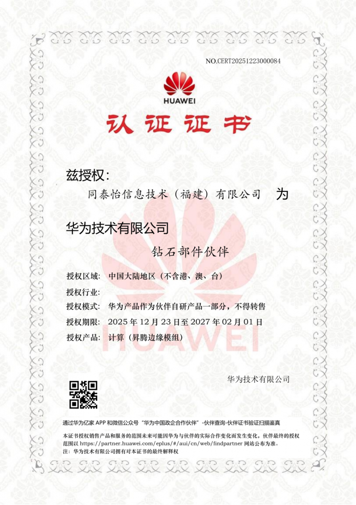 同泰怡是华为认证的“双钻石部件伙伴”(KPN+APN),“钻石部件伙伴”是华为面向合作伙伴体系中的最高授权等级之一,代表华为对其技术能力、市场贡献与协同发展潜力的最高度肯定。获得该地位,意味着同泰怡并非普通的销售代理或服务商,而是获准将华为的核心计算硬件(鲲鹏模组/昇腾NPU)作为关键部件,深度集成到自主设计与研发的整机或解决方案中。这种“华为硬件+伙伴自研”的合作模式,要求伙伴具备强大的硬件设计、底层调优、软件适配及行业应用开发能力。同泰怡连获双项认证,充分证明了在技术整合与行业创新上的卓越实力,已跻身华为核心生态圈,能够基于华为的“根技术”共同打造面向客户需求的创新型联合解决方案。